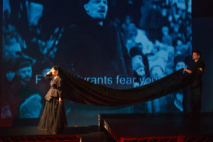 But that’s only the start of their 21st century adventure through the looking glass. They are hounded by religious fundamentalists, plunged into a digital nightmare of new media, diverted by Ophelia as a stripper, experiment with gender roles, conscripted into a Dolce and Gabbana fashion show, then finally launched headlong into the conflicts and tragedies of the Arab Spring, from which they emerge more dazed, confused, and maddened than ever. “Oh, what a noble mind is here o’erthrown,” intones a grief-stricken Horatio. This way madness lies, indeed. But as they stand in the final snowstorm, facing a bottomless sea, they confront the question with which they began: to be or not to be. What answer do they finally offer?